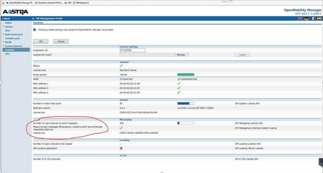 Pour envoyer des messages sur des IP-dect au niveau de l’Open Mobility Manager, il faut la licence « Messaging » comme indiqué ci-dessous :