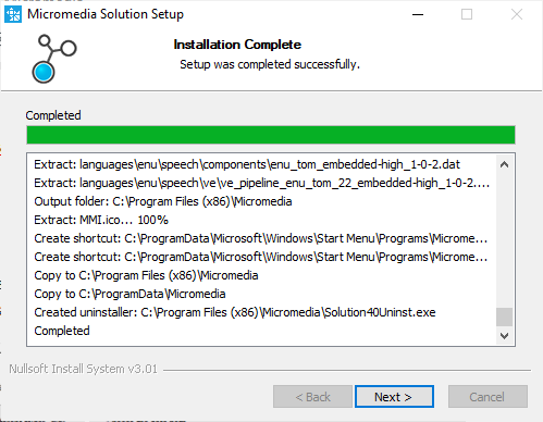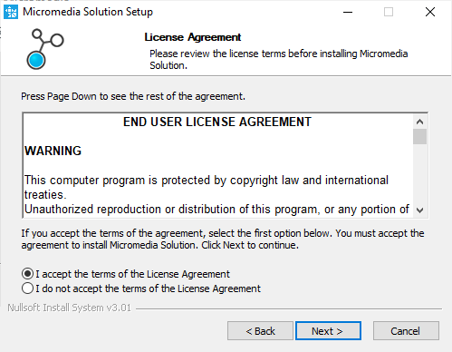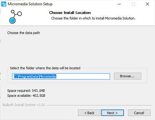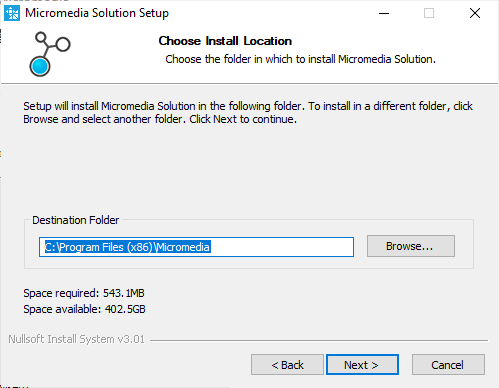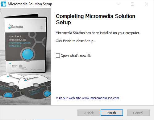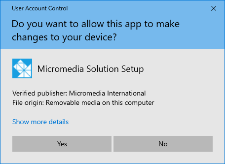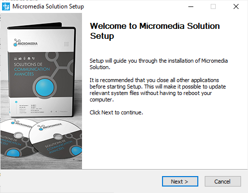 Pour lancer l’installation de la Solution Micromedia, connecter la clé USB d’installation. Si le programme d’installation ne démarre pas automatiquement après quelques secondes, lancer le programme d’installation situé à la racine de la clé : « SETUP.EXE ». L'installation requiert des droits administrateur.