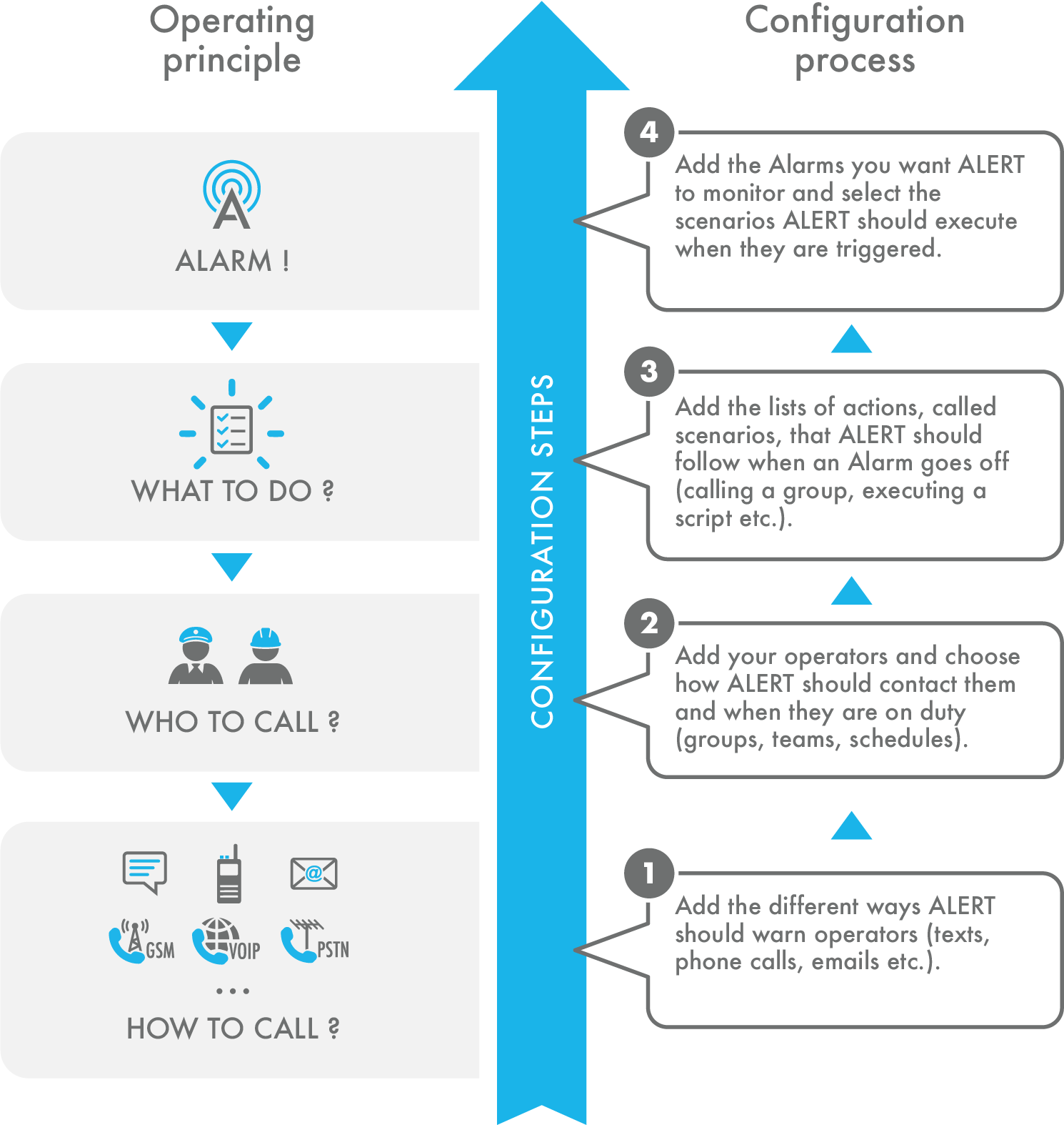Contacter des opérateurs à l'apparition d'une alarme est la fonction principale d'ALERT. Il est cependant préférable de suivre une méthode de configuration afin de simplifier le paramétrage du logiciel.