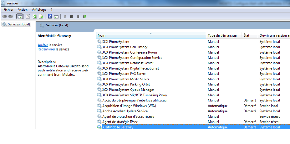 Après l'installation d'AlertMobileGateway, un service Windows distinct a été créé, voir capture d'écran ci-dessous. Comme tous les services Windows en tâche de fond, ce service peut être démarré et arrêté.