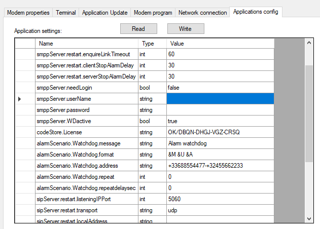 Les paramètres de scénario sont réglables dans l'onglet "Applications config" de SiwiUpdate. Pour le moment le scénario "watchdog" est utilisé par le smppService. Le scénario "Dataconnection" est lui utilisé par le service datacnxService.