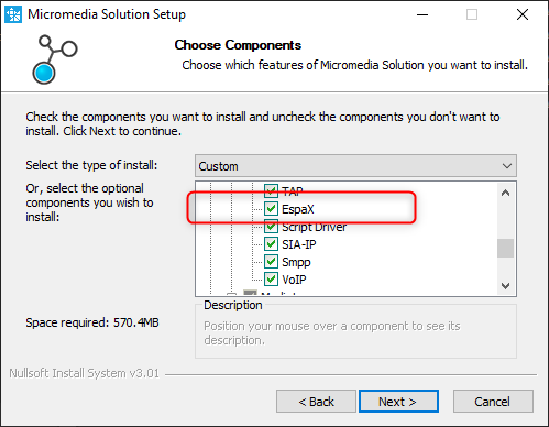 Lors de l'installation du logiciel ALERT, il faut sélectionner le composant EspaX dans la liste de Gestionnaires de communication.