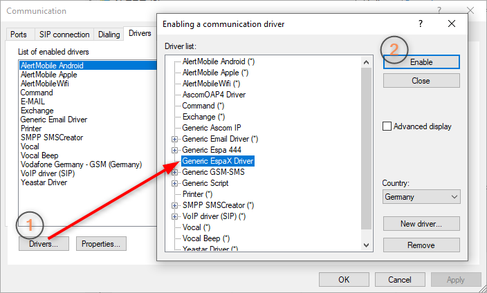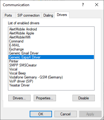 (ALERT -> Configuration -> Communication -> sélectionner l'onglet Drivers)