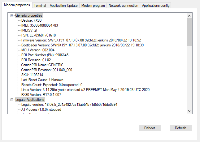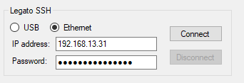 Once started, connect the tool to the modem. The connection is an IP connection using SSH. Enter the requested parameters in the "Legato SSH" group. (See capture below. FYW: Legato is the Sierra Wireless framework name used for embedded application)s.