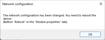 A "Reboot" button can be found on the "Modem properties" screen.