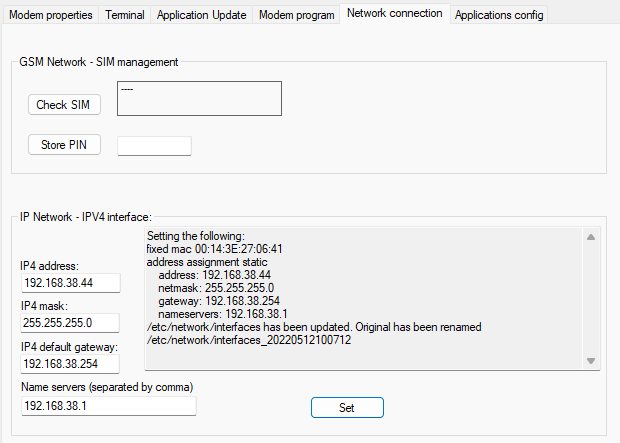 Enter the new IP address and the network mask. Then press "Set".