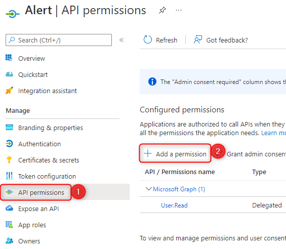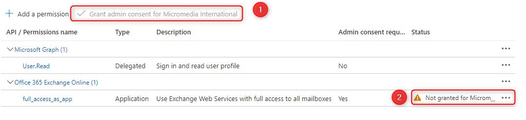 If it turns out that you have the mention "not granted for XXXX" (2) you will have to ask the office 365 administrator to click on "Grant admin consent...." (1) by giving him the name you gave during 'application registration (ALERT_VA for this example) |