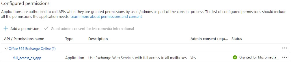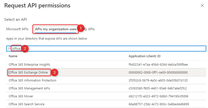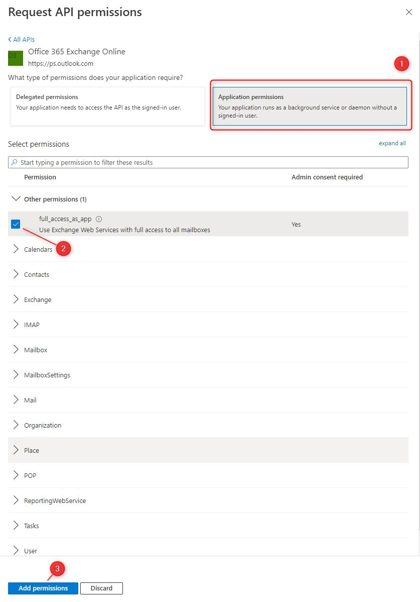 Select APIs in my organization uses -> Office 365 Exchange Online -> Application Permission -> Check full_access_as_app :