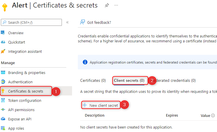 Now we need to create a client secret for the application, click Certificates and secrets -> client secrets and add a new client secret.