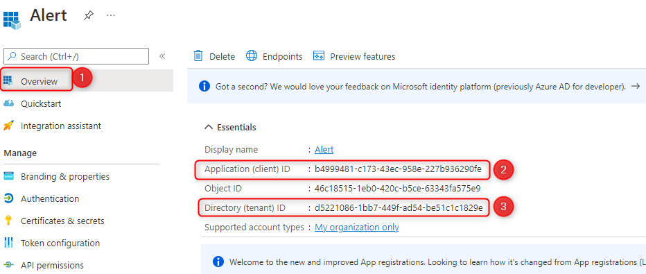 Now you can click Overview to find your client id and tenant id. This 2 informations will be used in the configuration of Exchange driver in ALERT.