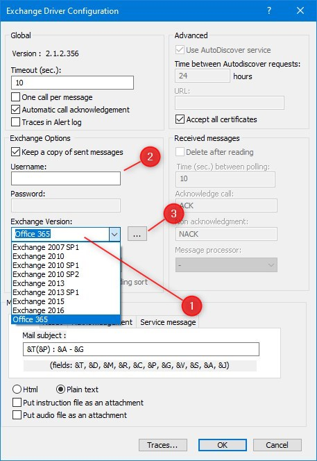 In the Exchange driver configuration you must select "Office 365" in Exchange version: