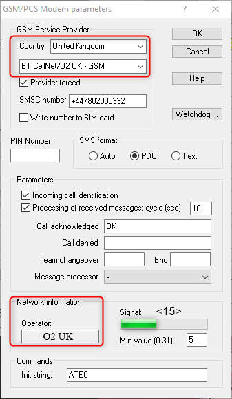 - 3. In ALERT check that the modem is configured with the correct network operator of the SIM card (as below)