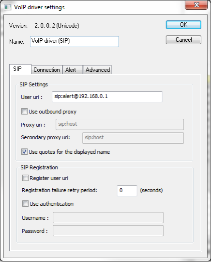 The softphone will call ALERT using sip:alert@192.168.0.1:5080