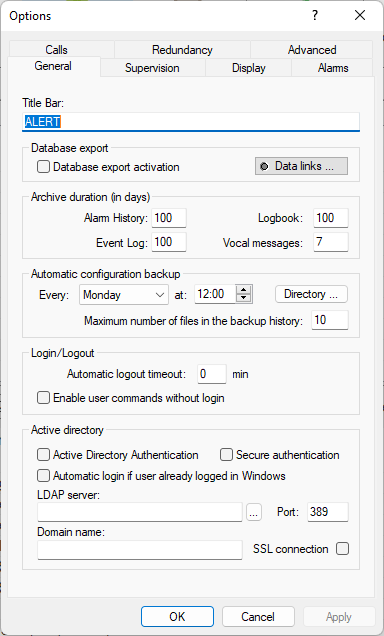 ALERT 4.0 peut utiliser les services d'identification et d'authentification de Windows (services d'annuaire LDAP d'Active Directory) pour identifier et authentifier les accès au logiciel. Lorsque cette option est validée, l'accès de chaque opérateur déclaré dans ALERT 4.0 sera contrôlé par le serveur Active Directory du domaine et le mot de passe à saisir sera obligatoirement celui déclaré dans le serveur Active Directory et non le code numérique défini dans le champ "mot de passe" de la fiche opérateur.