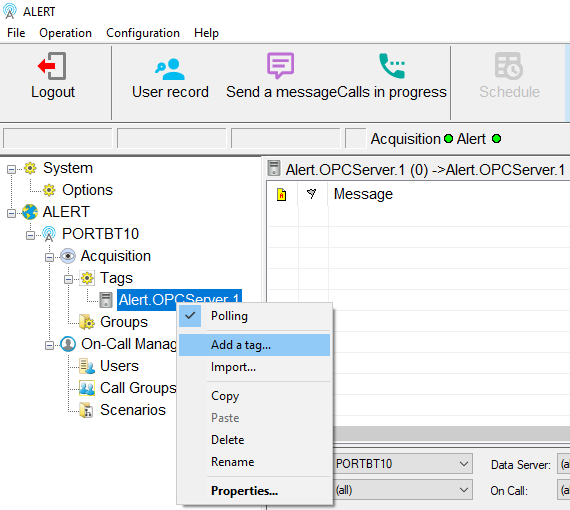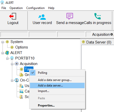 In order to establish communication with the remote "ALERT Tunneler" module, you must declare a new data server. Do a right-click on “Tags”, then click on “Add a data server…”: