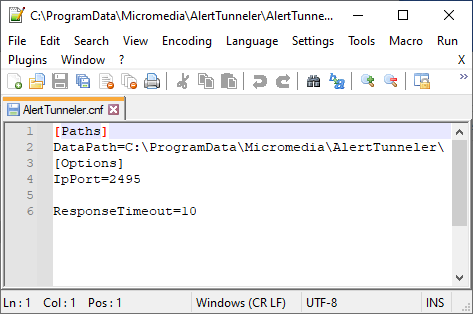 Ce fichier permet de configurer le port d’écoute du module « ALERT Tunneler » et l’emplacement du dossier de données :