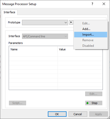 Afficher la fenêtre Configuration du Processeur Message (Configuration -> Processeur Message). dans la partie prototype, faire un click sur la flèche et sélectionner le menu Importer…