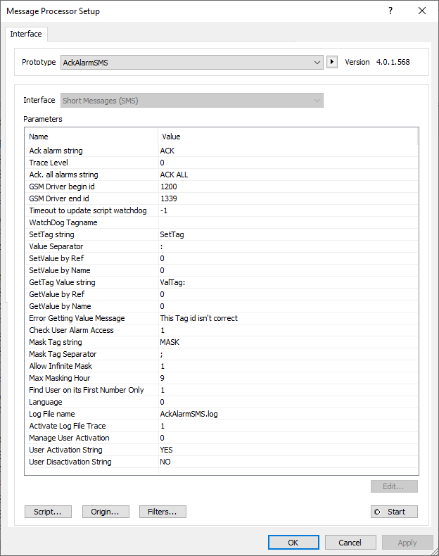 Pour importer le script AckAlarmSMS il faut suivre les instructions suivantes : Processeur message : Comment importer un script et sélectionner le fichier AckAlarmSMS.prx (en version 3.6 il faut sélectionner le fichier AckAlarmSMS.pro).
