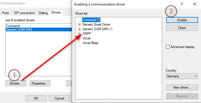 Remarque : si le driver n'est pas disponible, veuillez l'ajouter en appuyant sur le bouton "Nouveau driver..." et sélectionner SmppDrv.dll.