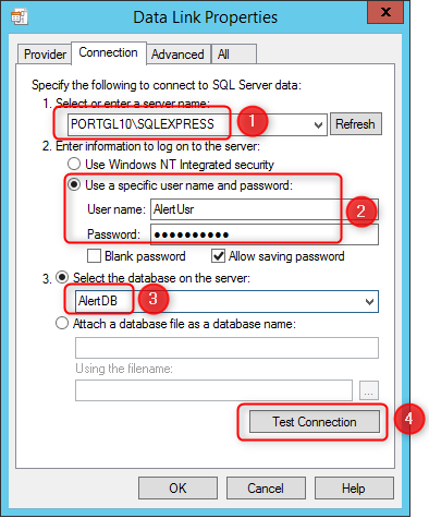 Nous utilisons les informations de connexion que nous avons créées sur le SQL Server préalablement "AlertUsr".