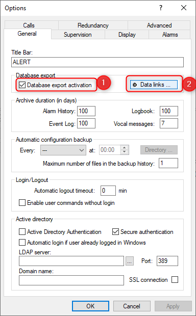 To enable Database export in Alert, you must go to "Configuration/Options" in Alert, on new window check "Database export activation" and click "Data links...":