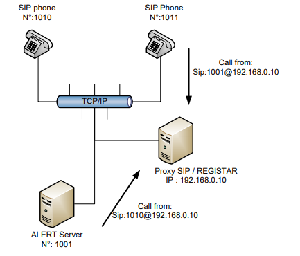 Ce type d’installation autorise des adresses IP dynamiques. Chaque équipement (y compris ALERT) s’enregistre au démarrage auprès du registar sip. Ce dernier est souvent le proxy.