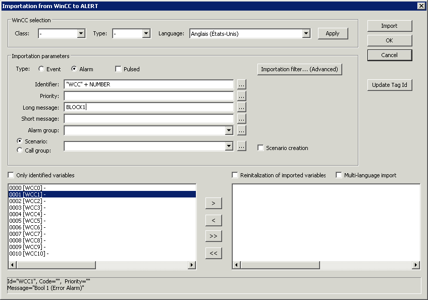 Lorsque les 2 fichiers sont configurés, valider en cliquant sur le bouton "OK" pour afficher la fenêtre "importation de variables depuis WinCC dans ALERT":