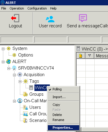 Effectuer un clic droit sur le serveur de données "WinCC" présent dans l'arborescence d'ALERT 4.0 puis sélectionner "Propriétés" :