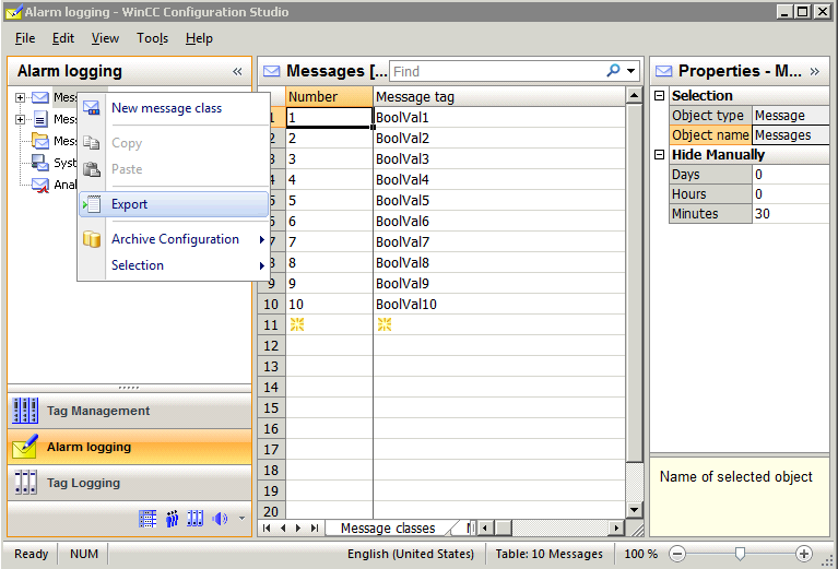 Pour cela, vous devez d’abord dans WinCC, exporter les alarmes du module "Alarm logging":